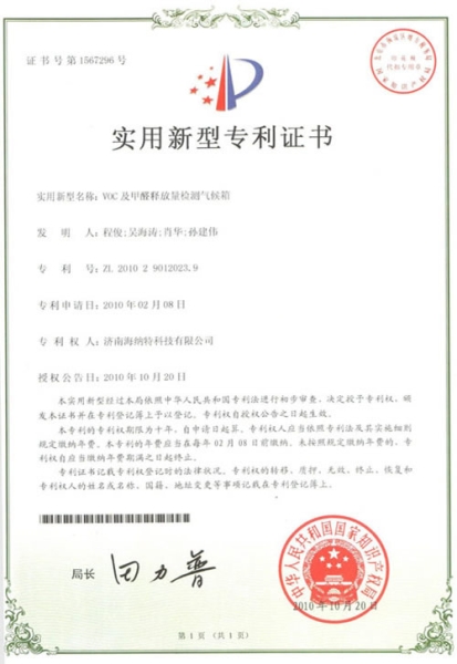 - VOC及甲醛釋放量檢測(cè)氣候箱專利證書(shū)