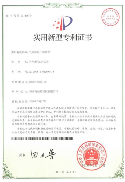 - 氣源凈化干燥裝置專利證書(shū)