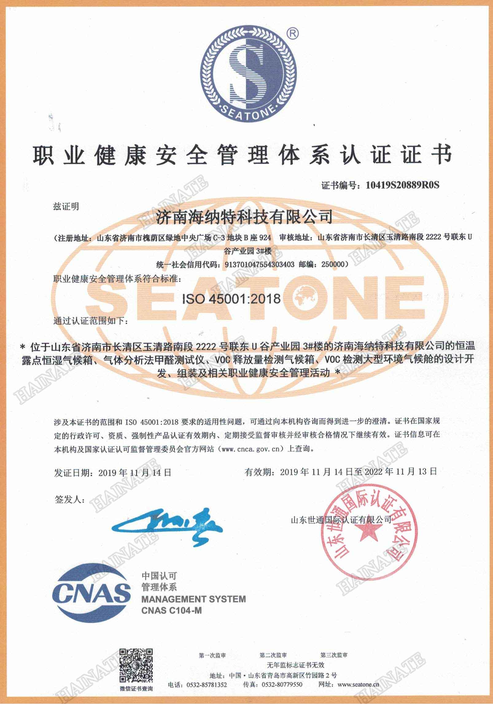 - 職業健康安全管理體系認證證書
